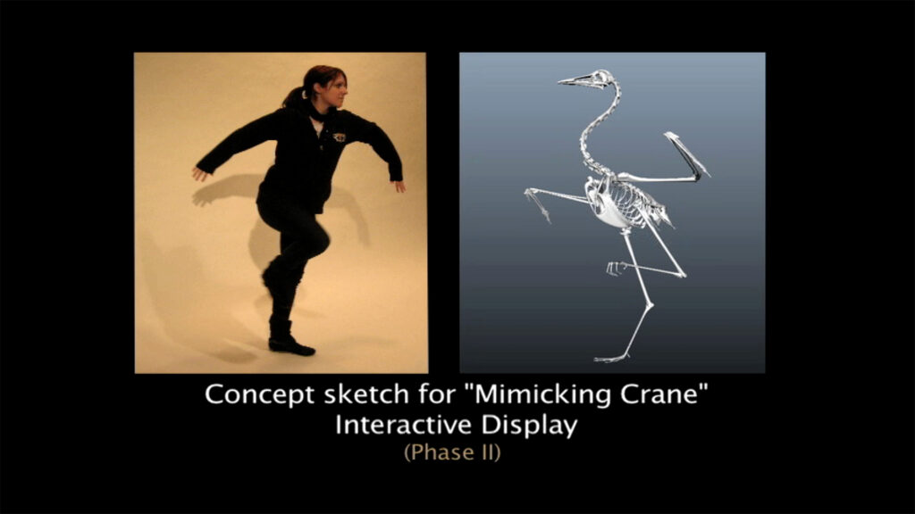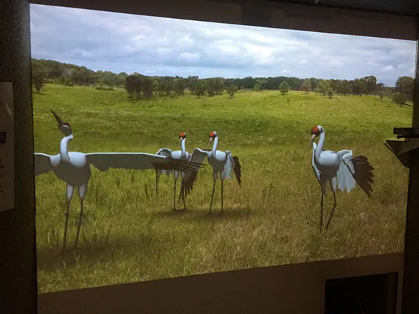 Mimicking Whooper allows the audience the opportunity to observe and mimic the movements with the Whooping Crane. The viewer stands in front of a life size projection of the animated cranes and when they move, the animation mimics their movement creating empathy and a type of communication with the rarely encountered species.The Crane has approximately 30 communicative gestures and many distinct vocal forms of communication that can be explored by the viewer.