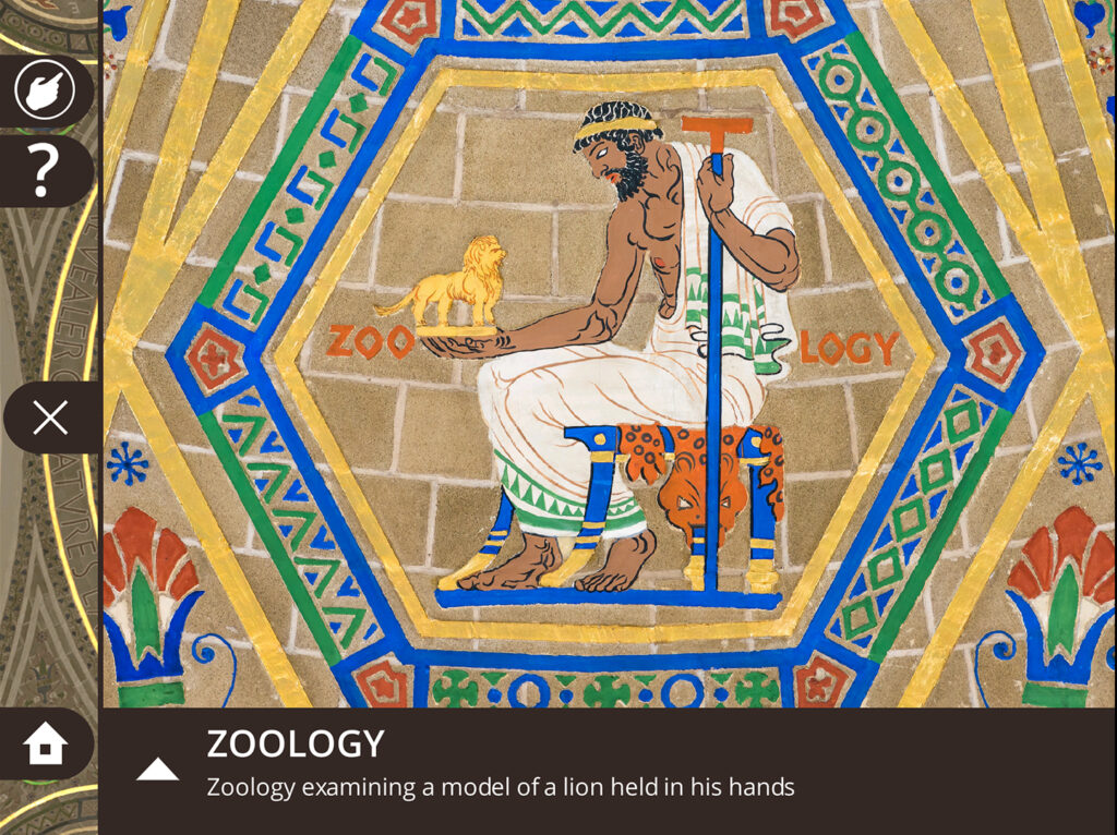 The main interface is spatially aligned with the NAS Great Hall, therefore holding up an iPad to the ceiling will bring the details of the ceiling closer to the viewer. The highlighted sections of the dome mural feature an in-depth exploration upon tapping.